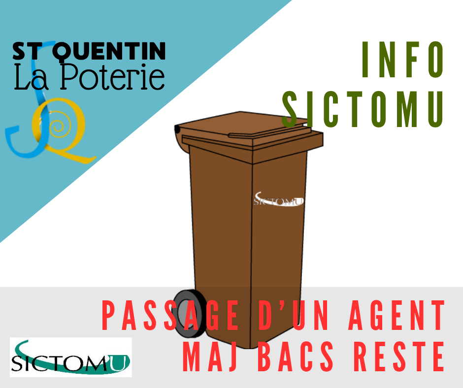 Nous vous informons qu’un agent du SICTOMU passera dans les prochaines semaines et mois dans la commune de Saint-Quentin-la-Poterie afin de faire des mises à jour des bacs reste. Cette opération se fera les jours habituels de passage (jeudi pour Saint-Quentin).
