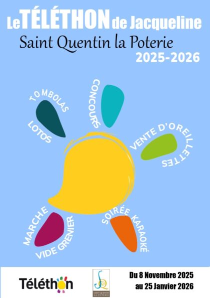 Retour aux événements TELETHON DE JACQUELINE Du 08/11/2025 au 25/01/2026 + Ajouter au calendrier Récapitulatif Date et heure Du 08/11/2025 au 25/01/2026 Lieu 30700 Saint-Quentin-la-Poterie Comment s'y rendre