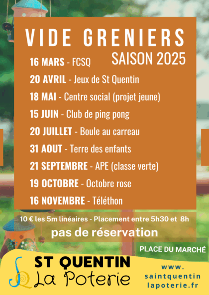 La mairie de Saint Quentin la Poterie organise chaque année un vide grenier mensuel de mars à novembre, soit 9 dates dans l’année. Ils sont organisés en général les 3èmes dimanche du mois (sauf exception).