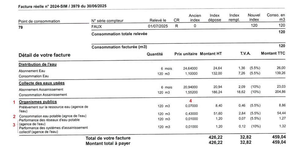 La réforme des redevances des agences de l’eau, entrée en vigueur le 1er janvier 2025, vise à moderniser et à rééquilibrer le financement de la gestion de l’eau en France. Les trois anciennes redevances ont été supprimées et remplacées par trois nouvelles, ce qui induit plusieurs changements majeurs qui se traduisent sur votre facture d’eau. Les rubriques “distribution de l’eau” et “collecte et traitement des eaux usées” regroupent les éléments du tarif de l’eau fixé par la collectivité, lui permettant d’investir et d’assurer la disponibilité de l’eau au robinet et de l’assainir.